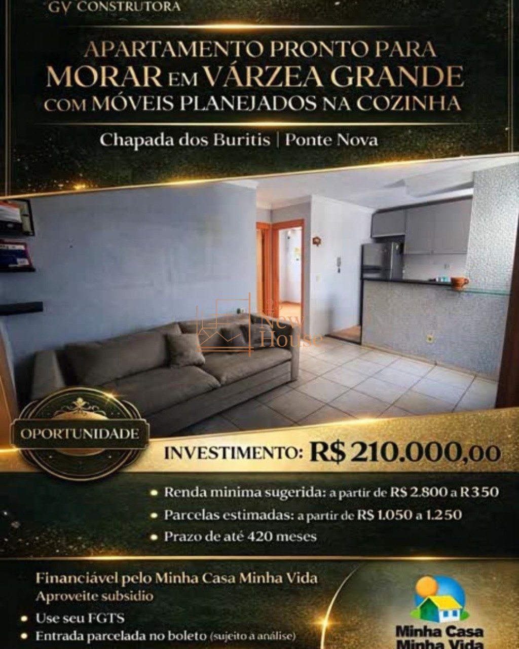APARTAMENTO PRONTO PARA MORAR EM VÁRZEA GRANDE Chapada dos Buritis | Ponte Nova Seu APÊ próprio pode custar MENOS que um aluguel! INVESTIMENTO: R$ 210.000,00 Renda mínima sugerida: a partir de R$ 2.800 a R$ 3.500 Parcelas estimadas: a partir de R$ 1.050 a R$ 1.250 Prazo de até 420 meses Financiável pelo programa habitacional Use seu FGTS Entrada parcelada no boleto (sujeito à análise) Aprovação rápida com vários bancos! DETALHES DO IMÓVEL 40 m² bem distribuídos 02 quartos com piso vinílico moderno Banheiro social Cozinha com bancada americana + planejados Teto com acabamento em gesso Garagem coberta Diferencial: possibilidade de negociação com eletrodomésticos CONDOMÍNIO COMPLETO (PADRÃO CLUBE) Piscina adulto e infantil Churrasqueira gourmet Salão de festas Lavanderia Mercadinho interno Vagas para visitantes Portaria 24h LOCALIZAÇÃO ESTRATÉGICA Região Ponte Nova - Várzea Grande Fácil acesso para Cuiabá Próximo de mercados, escolas, farmácias e comércio ATENÇÃO - CONDIÇÃO ESPECIAL Entrada pode ser parcelada no boleto Condições facilitadas por tempo limitado Peça a sua simulação rápida e sem compromisso Aprovação de crédito completa Acompanhamento até a entrega das chaves SONHOU FINANCIOU COMPROU