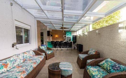 Apartamento garden semi mobiliado com 102m² com sala para dois ambientes, cozinha moderna e repleta de armários com eletrodomésticos, área gourmet com churrasqueira, bancada, forno, figão com 2 quartos, sendo 1 suíte, e 2 banheiros no total, 1 vaga de garagem. Piso de madeira e porcelanato, ventilador de teto, armários planejados em todos os ambientes, teto retrátil na área gourmet.