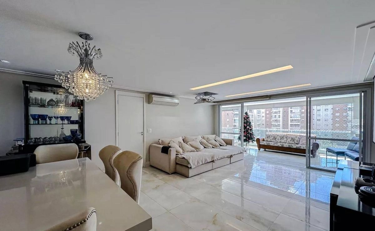 Apartamento de alto padrão com 4 suítes, lavabo, banheiro de empregada, área de serviço, despensa e depósito. Possui área gourmet com churrasqueira e forno, hidromassagem e ar condicionado. Voltado para a área interna do condomínio, é silencioso e recebe sol o dia todo. São 4 vagas de garagem.