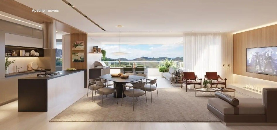 Sala ampla para 02 ambientes, estar íntimo, adega, lavabo, varanda gourmet, vista panorâmica, 04 quartos confortáveis sendo 01 suite com closet, 01 suite com varanda e 02 semi suites, janelas com venezianas integradas, cozinha espaçosa e planejada com bancadas em granito, área de serviço independente e banheiro de serviço. Diferenciais: 04 vagas Hall privativo Vista panorâmica Box de despejo privativo Janelas com venezianas integradas Lajes espessas e janelas com proteção acústica