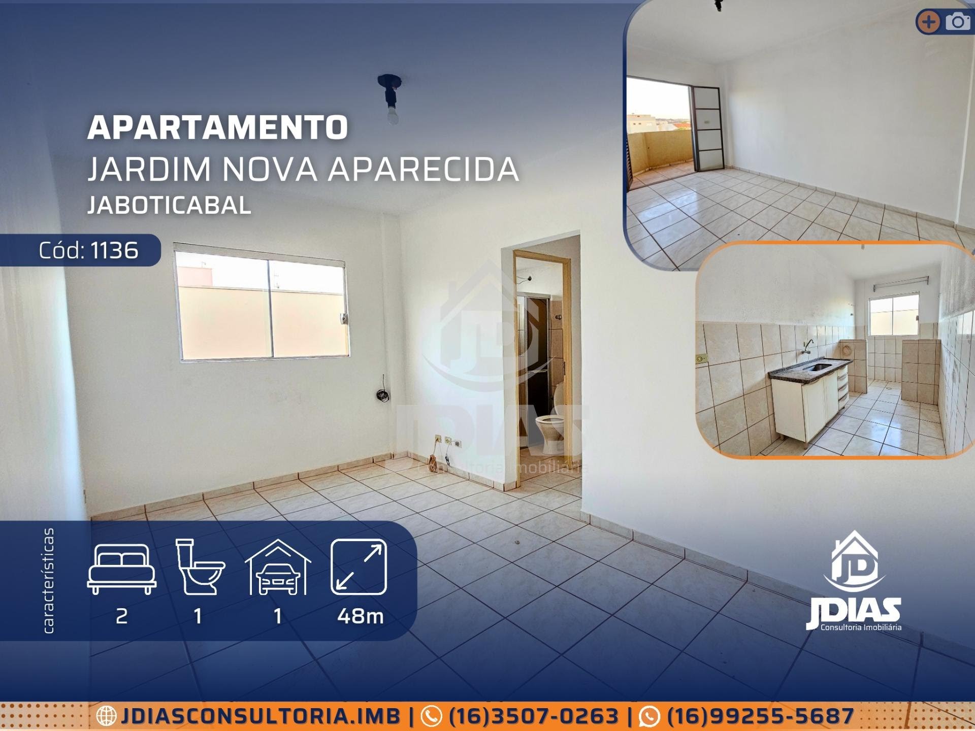 <b>Apartamento em Jardim Nova Aparecida - Jaboticabal, SP - Cód: 1136</b><br> <b> 2 Dormitório(s)</b><br> <b> 1 Banheiro(s)</b><br> <b> 1 Vaga(s) - 1 coberta</b><br> <b> Área construída: 48</b><br> <b> Área total: Não possui</b><br> <b> Armário(s): Cozinha / Banheiro</b><br> <b> Mobiliado: Não é mobiliado</b><br><br> <b>Informações para Alugar:</b><br> • Incluso no aluguel: IPTU / Água / Condomínio<br> • Garantia Locatícia: Fiança digital (Sem fiador, zero-burocracia, segurança e rapidez)<br> • Faça uma simulação em: "simular garantia para locação" e saiba se já pode alugar o imóvel.<br><br> <b>Informações do Empreendimento/condomínio:</b><br> • Principais itens do condomínio: Câmeras / Água / Manutenção / Jardinagem <br> • Animal: Aceita pequeno porte<br> (valor de taxa condominial sob consulta)<br><br> <b>Mais info, fotos e valores Agende uma visita: </b><br> • End: R. Humberto Biancardi, 167 - Vila Serra, Jaboticabal<br> Receba novidades em primeira mão: <br><br> Obs.: Valores e informações descritas sujeito alterações a qualquer momento, validação mediante a verificação de disponibilidade e confirmação. <br>