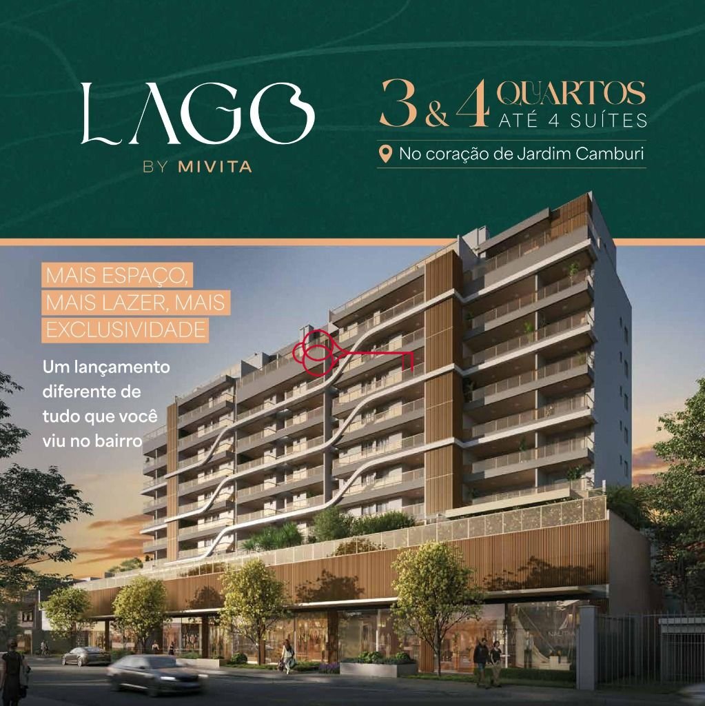 LAGO BY MIVITA OPORTUNIDADE ÚNICA! A você que ama o Bairro de Jardim Camburi; tenho uma excelente notícia: A construtora está realizando o pré-lançamento do esperado empreendimento LAGO BY MIVITA, localizado no amplo terreno onde funcionou o tradicional cerimonial. Jardim Camburi é o bairro mais populoso da capital, considerado bairro-cidade pois tem a melhor infraestrutura e o que mais cresce e se valoriza em Vitória. Possui ruas e praças arborizadas; a poucos minutos da orla da Praia de Camburi (calçadão de Camburi, Atlântico Parque e ao aeroporto). É autossuficiente e cheio de qualidade de vida, com feirinhas, Shopping, Faculdade; e vida noturna própria; comércio em geral, vários supermercados, igrejas, parques: Botânico da Vale e da Fazendinha. Dá para fazer de tudo sem precisar sair do bairro. Empreendimento com apenas 48 (quarenta e oito) unidades, de altíssimo padrão todos de frente e sol da manhã. Seja um dos privilegiados proprietário(a) e futuro morador desse imponente condomínio de luxo. Três quartos (100m²; garden 136m² e cobertura duplex com 184m²), e quatro quartos (136 a 154m²; garden 190 a 270m² e cobertura duplex de 238 a 252m²). A localização do LAGO BY MIVITA foi escolhida de maneira estratégica para facilitar o dia a dia dos privilegiados moradores. Próximo aos principais serviços, comércios e lazer de alto padrão e abriga os restaurantes mais bem avaliados da cidade. Ótima mobilidade urbana, a poucos metros da Rodovia e da BR 101. Presenteie você e sua família com este exclusivíssimo empreendimento. Vocês irão se surpreender!