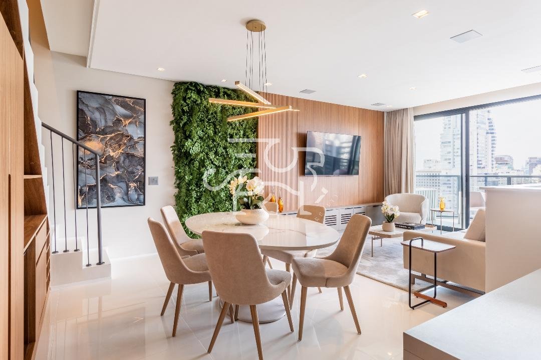 Código do Imóvel: CM1799756-1 - Imóvel anunciado, através da plataforma. Duplex com 2 suítes, mobiliada e decorada no conceito minimalista, trazendo metais dourados e tapeçaria em tons de cinza claro. Possui automação de som, jardim vertical, um living integrado com cozinha, sala de jantar e varanda aberta que contempla a bela paisagem do bairro sofisticado de São Paulo. Desfrute das comodidades do condomínio com Recepção com Concierge, Mega Lounge, Coworking com sala de Reunião, Guarda-Entrega, Complexo Fitness com mais de 1.150m2 com Spa, Sauna, Piscina coberta com raia de 25m e equipamentos de fitness, Quadras de Tênis e Squash.