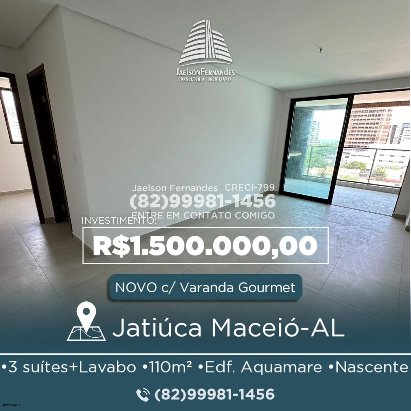 EDIFÍCIO AQUAMARE RESIDENCE, novo, composto de 18(dezoito) Pavimentos, sendo um pavimento subsolo, um pavimento pilotis, um pavimento garagem, 13 pavimentos tipo com nove unidades de apartamentos cada, um pavimento cobertura e um pavimento ático. Apartamentos com 3 suites + lavabo, varanda gourmet, cozinha, sala de estar e jantar, 110m2, 2 vagas de garagens. Área comum: Cowork Salão de Festas Piscina Adulto com vista panorâmica Piscina Infantil Churrasqueira Playground Ginástica Gerador Full Recepção decorada Uma localização perfeita. Bairro - Jatiúca - Maceió Investimento: 1.500.000,00 Condomínio R$ 650,00 incluso gás e água.