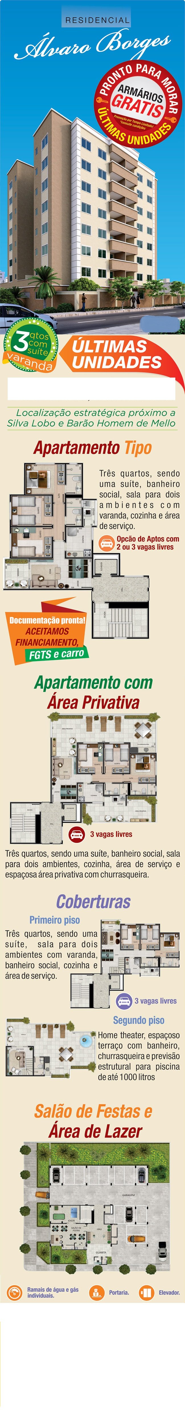 Prédio revestido, Novo, Elevador, Guarita, Salão de festas, Jogos, Água e gás individual Apto com sala pra 2 ambientes, piso porcelanato, Varanda, porcelanato, 3 quartos armários, piso em porcelanato, Banho social, piso em cerâmica e bancada em granito, Suíte, piso em porcelanato, bancada em granito, Cozinha, piso em cerâmica e bancada em granito, Área de serviço, piso em cerâmica, 2 vagas paralelas, cobertas. Área útil de 70.10 m².