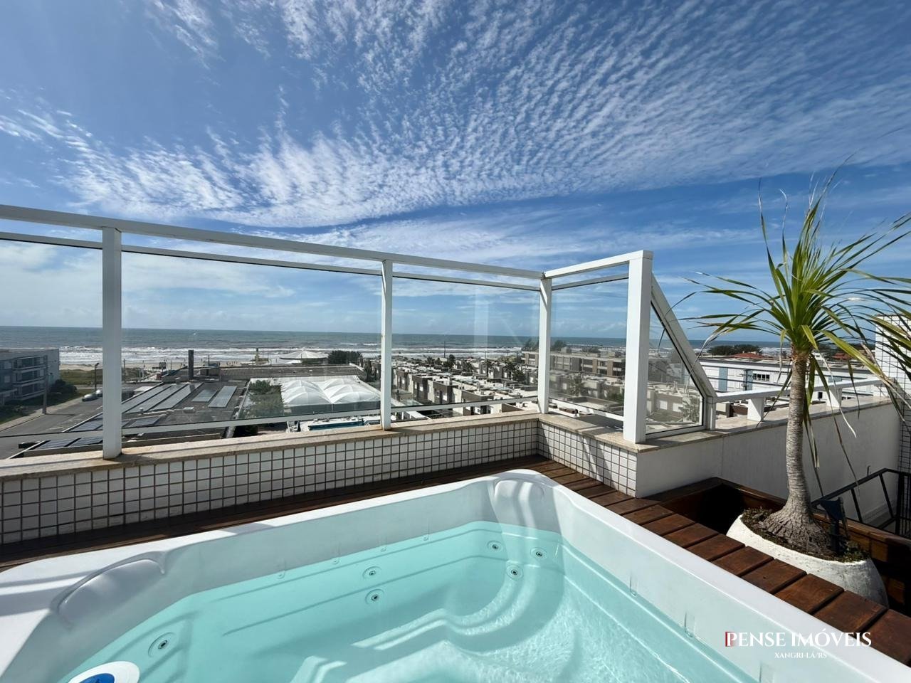 Apartamento composto por 03 dormitórios, sendo 02 suítes, living integrado, banheiro social, sacada de frente, área de serviço, terraço com deck, spa de hidromassagem, cozinha de apoio no segundo andar, vaga dupla para carro, vista para o mar de todos os cômodos.