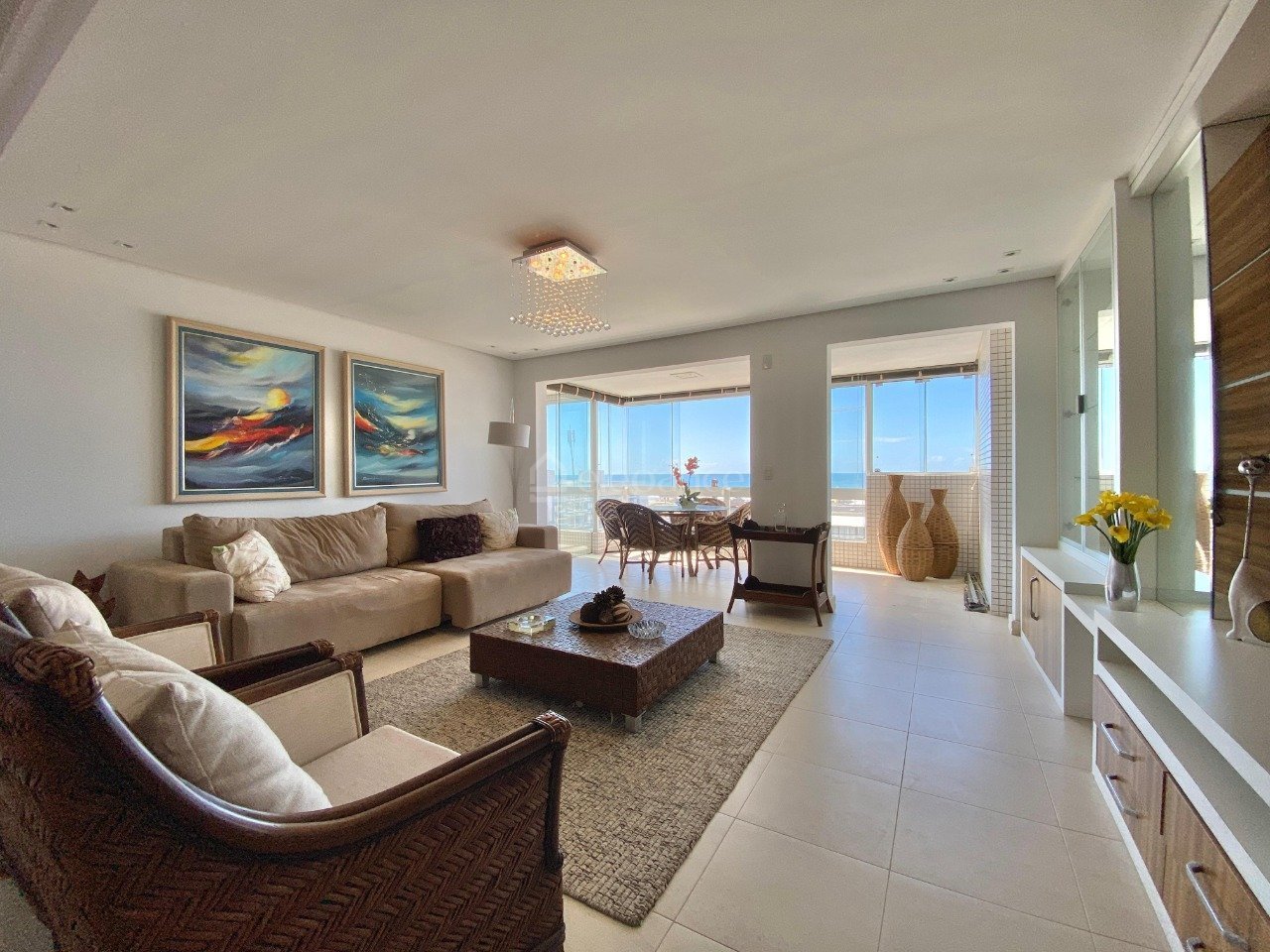Elegante cobertura duplex com vista panorâmica do mar, excelente localização, composta por 2 dormitórios sendo 1 suíte, living com 2 ambientes, sala de jantar/estar, andar superior com uma ampla cozinha americana, espaço gourmet com churrasqueira, banheiro social, deck com banheira de hidromassagem e uma belíssima vista panorâmica para o mar.