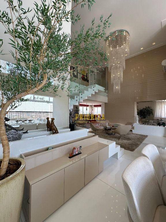 Código do Imóvel: CM1725183-7. Cobertura Duplex de luxo com design exclusivo! Esta cobertura duplex é a personificação do luxo e da sofisticação. Com ambientes elegantemente integrados, o apartamento oferece um lounge, um living, um espaço gourmet com sala de jantar e um home theater, cada um com sua funcionalidade específica. Um cantinho de inspiração oriental, perfeito para noites de comida japonesa, fica estrategicamente ao lado do living. A decoração é marcada por tons claros e neutros, com o bege e o branco dominando todos os ambientes. A marcenaria em laca branca, combinada com o piso e a escada de mármore, acrescenta um toque de requinte. No lounge com pé-direito alto, destaca-se um lustre de cristal com design exclusivo, que complementa o ambiente luxuoso. Os pontos de cor em vermelho e amarelo aparecem em almofadas e objetos decorativos, enquanto a cozinha se destaca pela ousadia com uma mistura vibrante de laca amarela e pastilhas prateadas. No segundo andar, encontram-se os ambientes íntimos, incluindo a imponente suíte master, a verdadeira estrela da residência. A suíte inclui um closet e uma sala de banho integrados, além de uma banheira estrategicamente posicionada no espaço da antiga varanda, proporcionando relaxamento com uma vista privilegiada. Com 8 vagas de garagem e dois depósitos privativos, esta cobertura foi cuidadosamente planejada, garantindo um lar único e luxuoso para quem busca exclusividade e conforto. Não perca a oportunidade de morar neste espaço incomparável!