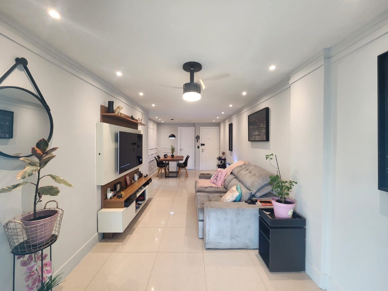 Apartamento de 114m, FRONTAL com varandão com cortina de vidro, decorado com porcelanato e iluminação indireta. 3 quartos sendo 1 suíte bem ampla com armários e ar condicionado. Banheiro social + banheiro de serviço. Sala em 2 ambientes. Cozinha e banheiros com armários. Prédio com piscina, sauna e salão de festas. 2 vagas de garagem.