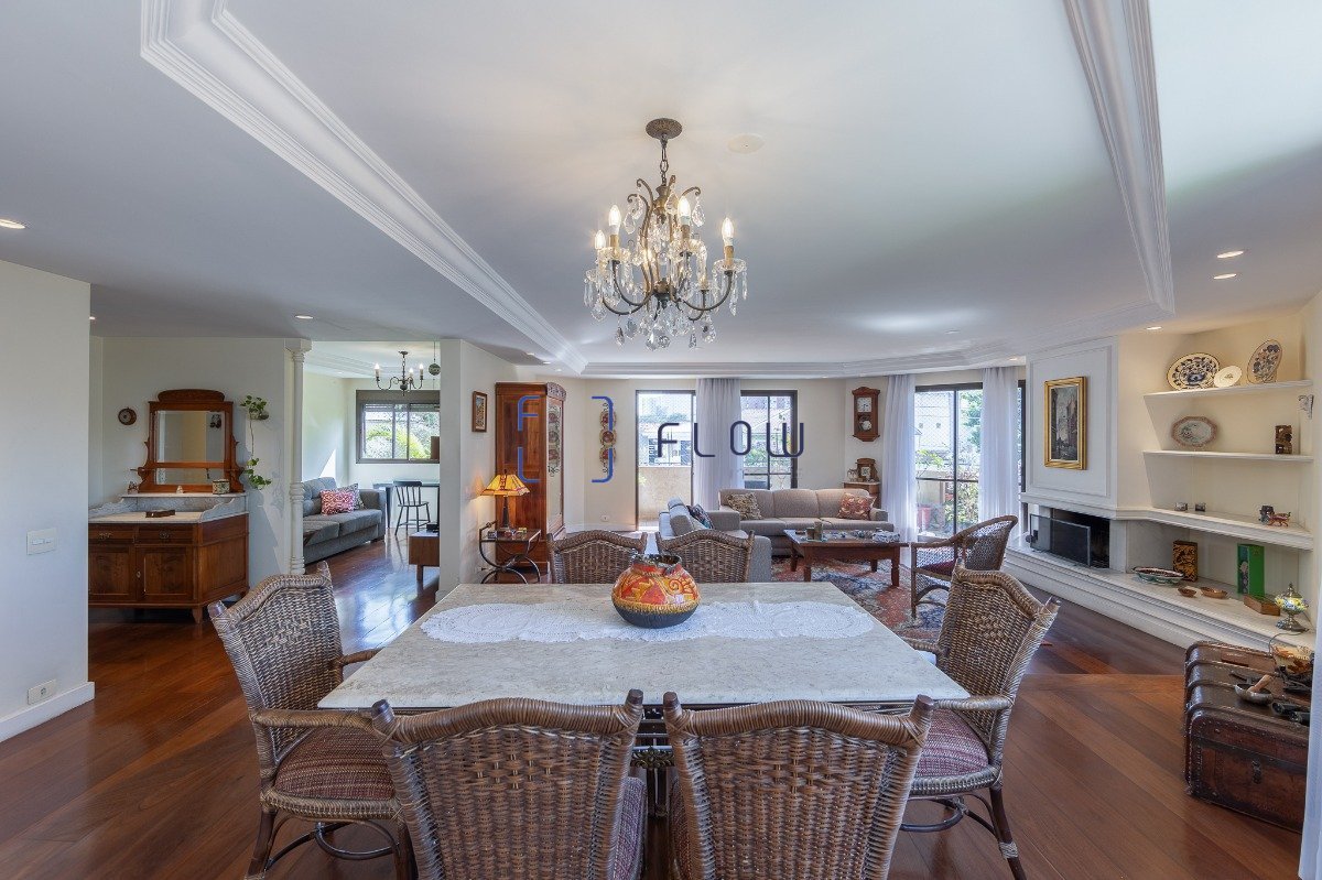 Apartamento com linda vista para a copa das árvores, sala para 3 ambientes com lavabo e um amplo terraço. Sala de estar com lareira criando um ambiente muito aconchegante. Saindo da sala, temos uma boa antessala que leva aos dormitórios, onde temos 3 suítes com sacada e ar condicionado, sendo que a suíte master tem closet, além de uma sala de TV que é o quarto quarto e pode ser facilmente revertido. Sala com piso em tábuas, banheiros com piso em granito. Ampla cozinha e copa, 02 dependências de empregada com banheiro. Um grande diferencial do apartamento é que além de gerador para o elevador e áreas comuns, o apartamento possui três tomadas selecionadas alimentadas com energia pelo gerador. O Campo Belo é conhecido pelas ruas arborizadas e pela atmosfera tranquila. Mas não é nada isolado, entre os pontos vizinhos estão Parque Ibirapuera, Aeroporto de Congonhas e dois centros empresariais da cidade, a Vila Olímpia e a Berrini.
