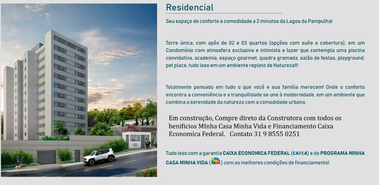 Em construção, com todos os benefícios do programa habitacional e financiamento acessível. Seu espaço de conforto e comodidade a 2 minutos da Lagoa da Pampulha! Torre única, com apartamentos de 02 em um condomínio com atmosfera exclusiva e intimista, e lazer que contempla uma piscina convidativa, academia, espaço gourmet, quadra gramada, salão de festas, playground e pet place, tudo isso em um ambiente repleto de natureza!!! Totalmente pensado em tudo o que você e sua família merecem! Onde o conforto encontra a conveniência e a tranquilidade se une à modernidade, em um ambiente que combina a serenidade da natureza com a comodidade urbana. Mais do que um lugar para morar, o residencial lhe proporciona um estilo de vida distinto, onde poderá compartilhar momentos especiais com quem você ama. Tudo isso com as melhores condições de financiamento!