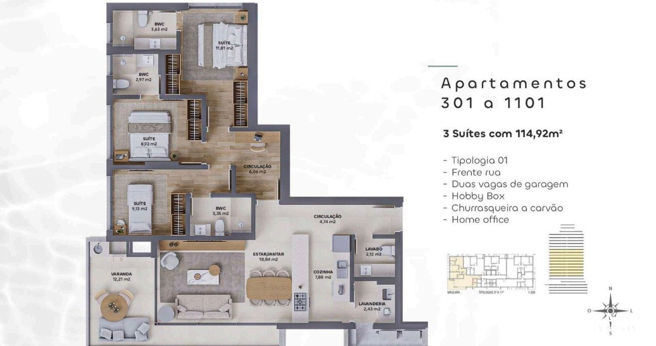 Apartamento com 3 quartos, todos suítes, que oferece conforto e privacidade para toda a família, além de um elegante lavabo para atender a área social. O amplo espaço integrado conecta cozinha, sala de jantar e estar, criando um ambiente moderno, funcional e acolhedor, perfeito tanto para o dia a dia quanto para receber amigos e familiares. A sacada com churrasqueira amplia as possibilidades de lazer, proporcionando momentos especiais com mais conforto e praticidade. A área de serviço é bem distribuída, garantindo organização e eficiência na rotina. Um imóvel que une sofisticação, excelente aproveitamento de espaço e qualidade de vida em cada detalhe.