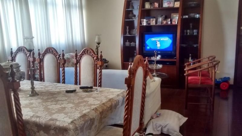 Prédio revestido em cerâmica e mármore, 6 andares, 2 por andar, Elevador, Salão de festas, Em torno de 30 anos de construção, 2 vagas, cabem 3 carros, 4 quartos com armários, piso em tábua corrida, Banho social e suíte com armário e box, piso em mármore e granito, bancada em mármore, Cozinha com armário, piso e bancada em granito, Área de serviço, piso em cerâmica, Dependência completa. Área útil: Em torno de 155 m²