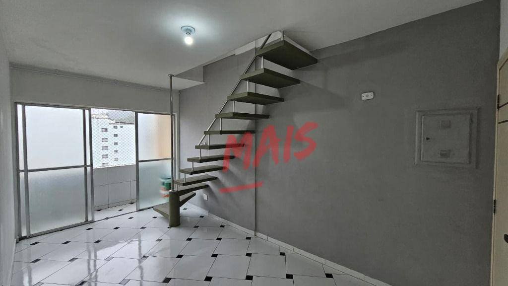 Código do Imóvel: CM1717649-4. Cobertura duplex próximo à praia. Parte inferior: sala com sacada, 1 dormitório, cozinha e banheiro social. Parte superior: sala com solarium, área de serviço e 1 suíte. Prédio com elevador, portaria e 1 vaga de garagem. Próximo à praia, mercado, padaria, farmácia, restaurantes e outros comércios da região.