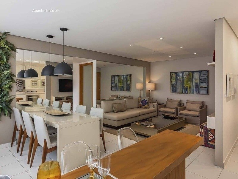 Sala ampla para 02 ambientes com piso em porcelanato, varanda, vista panorâmica, 03 quartos confortáveis com armários sendo 01 suíte, banheiro social, cozinha espaçosa com bancada em granito e armários planejados e área de serviço. Banheiros com armário, espelho e box em blindex. 02 vagas de garagem demarcadas.