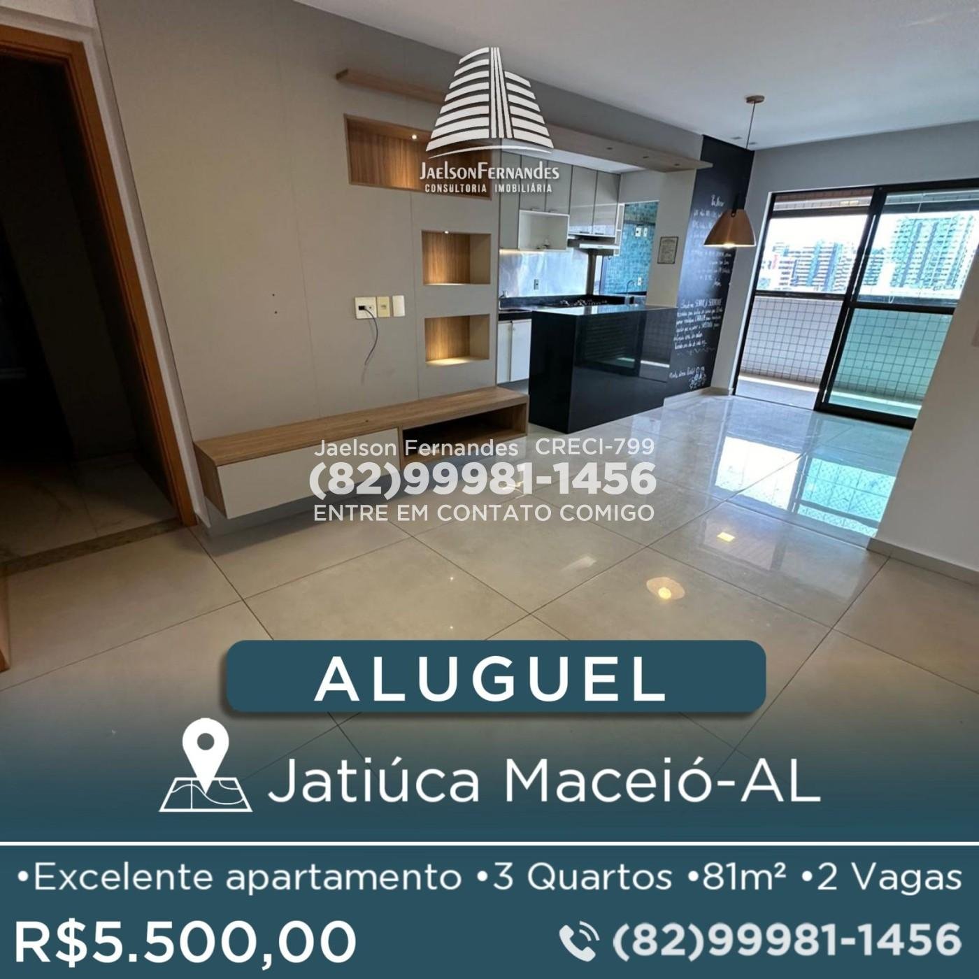 ALUGUEL EDIFÍCIO AQUASOL <br> Jatiúca Maceió - AL <br> <br> Conforto, modernidade e excelente localização! <br> <br> Apartamento disponível para locação no Edifício Aquasol, situado em um dos bairros mais valorizados de Maceió, próximo à praia, restaurantes, supermercados e tudo que você precisa no dia a dia. <br> <br> 81,15 m² de área privativa <br> 2 vagas de garagem <br> <br> 3 quartos (sendo 1 suíte) <br> WC social <br> Sala de estar e jantar integradas <br> Varanda gourmet <br> Cozinha funcional <br> Área de serviço <br> Móveis fixos planejados <br> <br> Estrutura completa de lazer e comodidade: <br> Salão gourmet <br> Salão de festas <br> Piscina <br> Espaço fitness <br> Brinquedoteca <br> Playground <br> Parquinho ecológico <br> Área com churrasqueira integrada <br> <br> Empreendimento moderno (entregue em 08/2019), com torre de 16 pavimentos e excelente padrão construtivo. <br> <br> Valor do aluguel: R$ 5.500,00 <br> (Valor já incluso condomínio e IPTU) <br> <br> <br> <br> Agende sua visita!