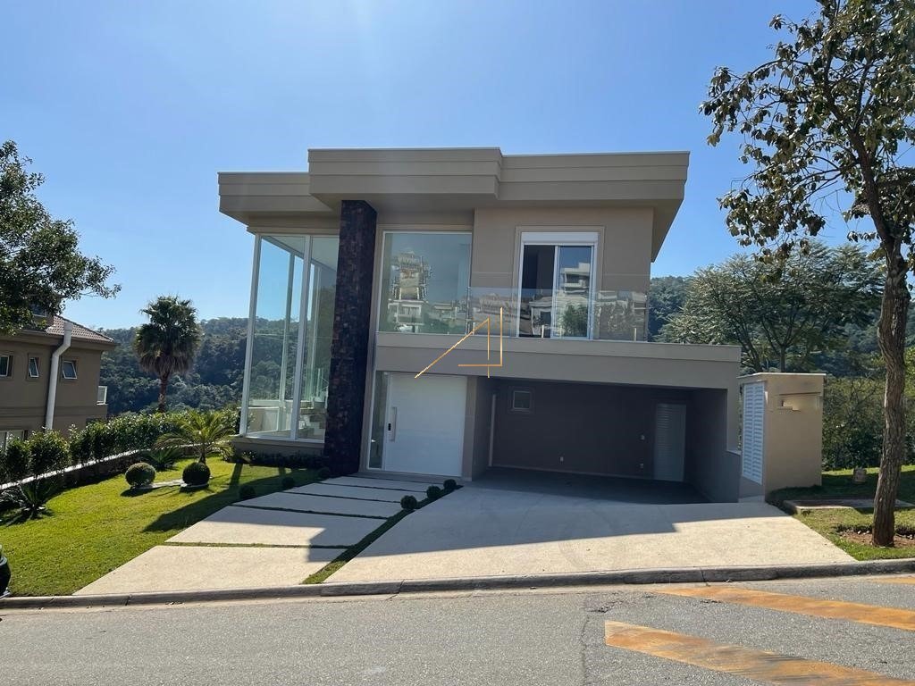 Terreno com 490 metros, área construída 435 metros Escritório, sala e espaço gourmet integrados com pé direito. Fino acabamento. Estrutura para ar condicionado em todas as suítes, escritório e sala. Alameda principal próxima à administração e portaria, com boa topografia em condomínio clube e com muita natureza, com lazer completo, salão de festas, churrasqueira, espaço happy hour, espaço infantil, academia, cyber café, salão de jogos, piscinas, espaço privativo para reuniões. Centro aquático: piscina coberta semi-olímpica, piscina coberta infantil aquecida e espaço hidromassagem. Sauna úmida. Quadra poliesportiva. Quadras de tênis. Fitness center com vista para o lago e a reserva atlântica. Sala de ginástica e pilates. Espaço infantil. Academia inclusa no valor do condomínio. Pavimento inferior no nível da rua integrada com área gourmet e piscina. Casa de alto padrão, fina e elegante. Primeira rua do condomínio. Muito próximo à portaria. Muito próximo à área de lazer. - 4 suítes sendo uma suíte máster; - 1 quarto de empregada com suíte; - 1 escritório; - 1 lareira; - 1 aquecedor solar central; - 6 banheiros sendo no master com banheira com vista para mata; - 1 home; - 1 lavabo; - Sala de estar integrada à área gourmet; - Cozinha gourmet; - Lavanderia; - Suítes com varanda; - Piscina borda infinita em L; - Banheiro para piscina; - Sauna; - Depósito; - Dispensa; - Elevador; - Garagem para 4 carros; - Churrasqueira na área gourmet. Um bairro completo com gastronomia variada, bares, serviços como hospitais, farmácias, supermercados, ensino público e particular e muito mais.