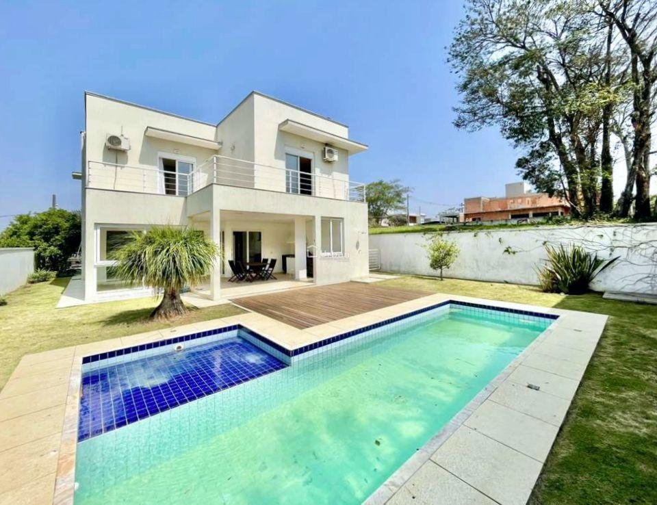 Casa contemporânea de alto padrão, totalmente envidraçada, ensolarada e com excelente ventilação natural, localizada em condomínio nobre, ao lado do shopping, com fácil acesso a comércios e serviços da região. Com acabamentos sofisticados, a residência conta com porta pivotante, pisos em porcelanato, madeira e fulget, portas e janelas em PC e vidro, louças e metais de qualidade. Living amplo para quatro ambientes integrado à varanda gourmet e piscina, com lareira, bar e jantar. São 4 suítes com terraços, armários e persianas elétricas, sendo a suíte master um destaque à parte, com dois closets, sapateira e banheiro com hidro. Escritório planejado com vista para o jardim, cozinha integrada totalmente equipada e área de lazer completa com churrasqueira, piscina iluminada com prainha e solarium.