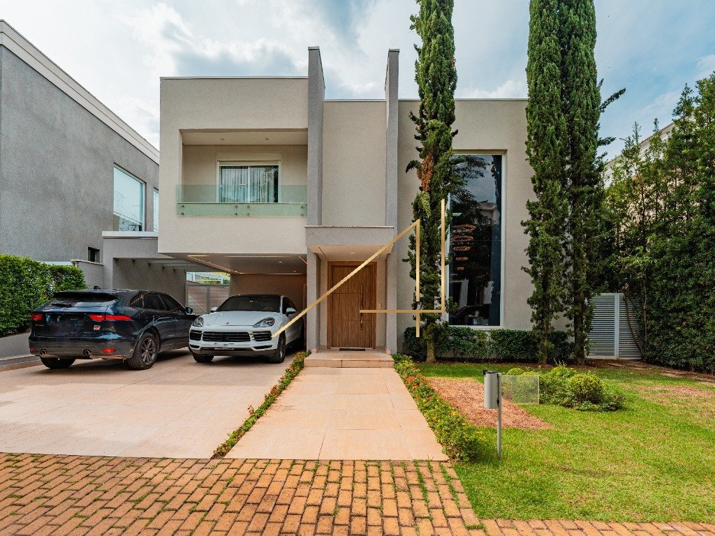 A residência possui espaços amplos, abertos para o verde. Áreas com pé-direitos duplos e ainda triplos, integrando os espaços, valorizando as vistas e a iluminação natural. DADOS DO IMÓVEL Área Terreno: 455,26m² Área Total Construída: 420,00m² Ambientes: 04 suítes com varanda (sendo 01 Master), 07 Banheiros (sendo 01 Master, 03 Suítes, 01 Lavabo, 01 Vestiário, 01 Serviços) Sala Íntima, Sala Estar, Sala Jantar, Cozinha, Área de Serviços, Dormitório de Serviços, Home Theater, Adega, Área de Churrasqueira, Terraço Externo Coberto, Piscina, Jardim e Garagem para 04 automóveis. CONDOMÍNIO O condomínio possui uma grande estrutura de esporte e lazer, incluindo: Quadras poliesportiva e de tênis, piscina adulto e infantil, fitness center, quadra de tênis em saibro e coberta, piscina aquecida, coberta e climatizada, SPA, saunas seca e úmida, sala de massagem e salão gourmet equipado. O condomínio conta ainda com portaria, vigilância 24 horas, central de monitoramento, sistema de câmeras, fiação subterrânea, praças, pista de skate, parede de escalada, trilha de mountain bike, playground, anfiteatro, mirante e pista de cooper.