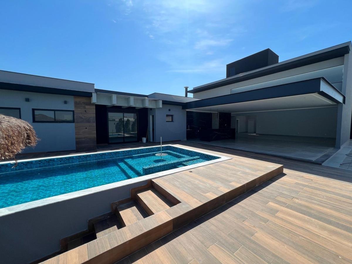 Código do Imóvel: CM1764325-4. Linda casa localizada no Residencial Saint Patrick. Possui 4 Suítes, Escritório com Banheiro, Sala de Cinema com Banheiro, Sala de Estar com Pé direito alto, Espaço Gourmet, Depósito, Área de serviço, Piscina com Bar molhado, Banheiro Externo e Lavabo interno. Com Área construída de 450 m² e Área de Terreno 1100 m². Garagem para 4 carros cobertos. Design by Rodrigo Latorre.