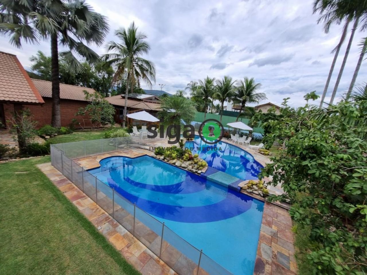 Preço Baixou, está abaixo dos valor das casas com o mesmo porte !!! - Casa a venda no JARDIM ACAPULCO, Praia do Pernambuco, Guarujá, com 2.100m² - 5 suítes com armários embutidos, sendo 2 com closet e banheiros com banheiras tipo ofurô em mármore, revestimento dos banheiros em mármore - Ar condicionado nas suítes e na casa em geral as suítes têm portas de acesso a um - Jardim particular com lago de carpas premiadas em cores diversas, prateadas, vermelhas, amareladas. O lago tem uns 5 m por 2,5m. - Sauna e ducha escocesa. - Casa de caseiro com quarto, sala, cozinha, banheiro e lavanderia. Lavanderia com depósito de material de limpeza, quarto de babá ou funcionários e banheiro, cozinha super espaçosa com ilha que facilita a movimentação do preparo de alimentos. Despensa de alimentos. Living, sala de jantar, sala de lareira, lareira funcional para o inverno. Amplo terraço com churrasqueira, imenso balcão como aparador e armários, pia, forno de pizza e câmara frigorífica, 2 lavabos, piscina enorme com design moderno, com pequena ilha e degrau com queda d'água, banco de 5 m com hidromassagem, jardim ao redor da piscina e da casa. Muitas plantas do jardim vieram do Sítio Burle Marx no Rio de Janeiro. Gazebo de 90 m2 (local de entretenimento) com Home theater, mesa de sinuca oficial (esta mesa é original de um famoso hotel e está restaurada). Garagem para 3 carros, Pequena horta junto ao quintal da lavanderia, atrás do gazebo há mais uma suíte. Quadra de tênis em tamanho oficial. Contém uma cisterna subterrânea azulejada com 30 mil Litros de água e mais 8 mil litros com caixas d'água sobre a casa. Telhado especial feito por grande especialista; as telhas são todas costuradas e amarradas umas às outras, o que dá total segurança nos dias de vento. A casa foi construída 1,10 m acima do nível da rua, o que evita invasão da água nos dias de