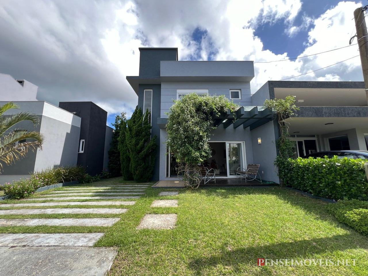 Casa frente norte, mobiliada e decorada no condomínio. Composta por 03 dormitórios (01 suíte com closet), banho social, lavabo, sala de estar com lareira, cozinha americana toda montada, espaço gourmet com churrasqueira, varandão no fundo, iluminação personalizada com luzes de sanca, aberturas em pvc, toda climatizada. 200m² de área privativa, 251,30m² de área total.