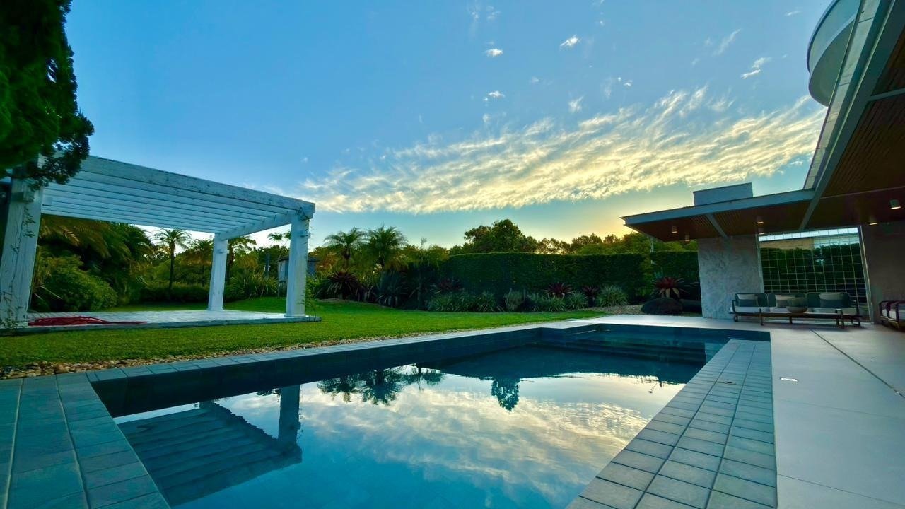 Luxuoso sobrado de 509m² em Atlântida, mobiliado e com 5 suítes. Possui amplo living com pé direito duplo, espaço gourmet e piscina, tudo com acabamento de alto padrão, automação e total privacidade em lote de esquina.