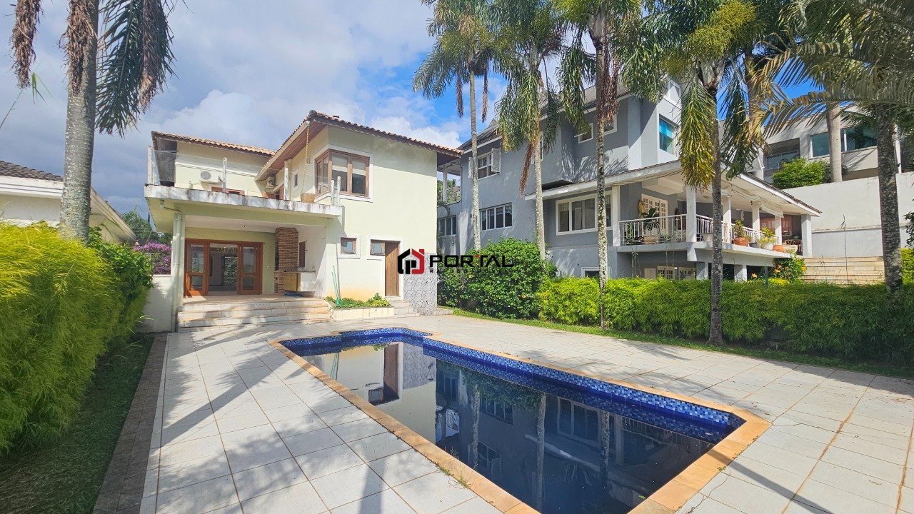 Casa com excelente padrão construtivo, muito bem conservada e pronta para morar, sem necessidade de reparos. Localizada próxima ao clube, em posição privilegiada, é bem ventilada, ensolarada e conta com vista agradável. Possui quatro acessos independentes: social, lazer, garagem e serviço. A entrada social é feita pelo terraço, proporcionando charme e privacidade. O escritório ou sala de home theater dispõe de lareira dupla face integrada ao living. A área social é composta por living para três ambientes, lavabo e salas de estar, jantar e lareira, com ventiladores de teto, oferecendo conforto e amplitude. A varanda gourmet integra-se à cozinha e à sala de jantar, equipada com churrasqueira, bancada, pia e armários, com vista e acesso ao quintal com área de lazer. Na área externa, a piscina de alvenaria é aquecida e iluminada, com escada interna, solarium, ducha e vestiário. O imóvel também conta com salão de festas com armários, sauna seca e ducha circular. Na área íntima, são quatro dormitórios com armários, sendo duas suítes. As suítes possuem ar-condicionado. A suíte máster conta com closet, amplo terraço com vista, hidromassagem, sanitários isolados e chuveiro duplo. A residência possui dois terraços, na frente e nos fundos. Os banheiros dispõem de gabinetes, box de vidro, nichos, espelhos e bancadas em mármore. A copa-cozinha é planejada, com duas cubas, armários, despensa e passa-pratos integrando à varanda gourmet. A área de serviço é funcional, com armários e dois tanques, além de apartamento de serviço independente. O acabamento inclui portas e janelas em madeira de ótima qualidade, pisos em tábuas largas, tacos de madeira, mármore, porcelanato, cerâmica e pedra Miracema, além de forro com acabamento em gesso em toda a casa.
