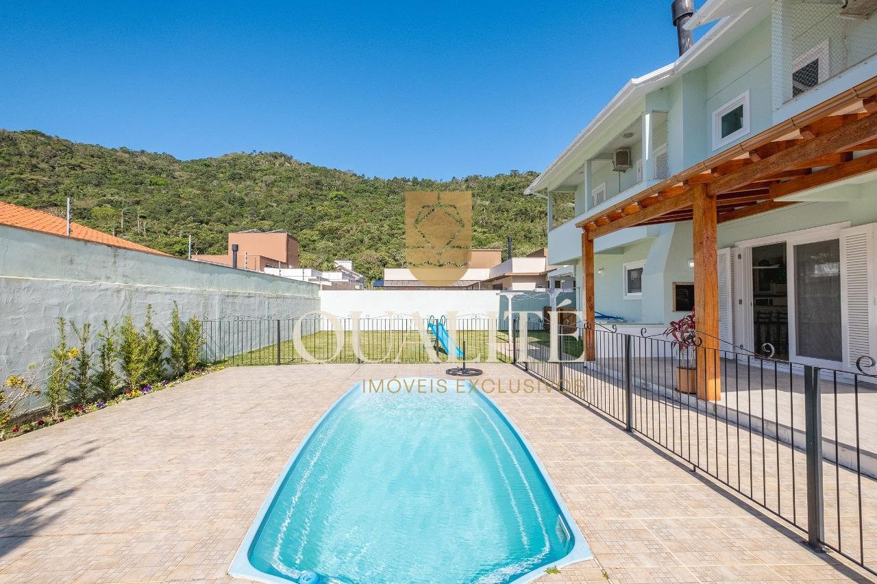 Essa casa clássica, localizada em um condomínio fechado na região de Cachoeira do Bom Jesus, possui 5 quartos, sendo duas suítes, 4 banheiros, lavabo, sala com 3 ambientes e lareira, perfeita para férias em família. A cozinha é ampla, com uma península que integra com a sala. A suíte master conta com banheira de hidromassagem e closet, além de sacada nos quartos. No andar de cima, há um escritório e uma sala. As esquadrias são de qualidade, todas as janelas possuem telas e os banheiros contam com ventilação natural. A área externa é ampla, com varanda e churrasqueira, piscina com grades de proteção e um grande quintal gramado com espaço dos dois lados da casa. A garagem coberta comporta dois carros, e há espaço para mais dois carros no pergolado lateral. Esse imóvel possui um grande diferencial: uma estação fotovoltaica que oferece conforto com economia. A fachada da casa é clássica e muito bem construída. O condomínio é calmo, com apenas 8 lotes e duas casas construídas. A propriedade está a 150 metros do mar, com acesso por um deck para a bela praia da Cachoeira do Bom Jesus, o melhor ponto da praia! Venha conhecer essa casa única, entre o verde das montanhas e o mar! Excelente oportunidade.