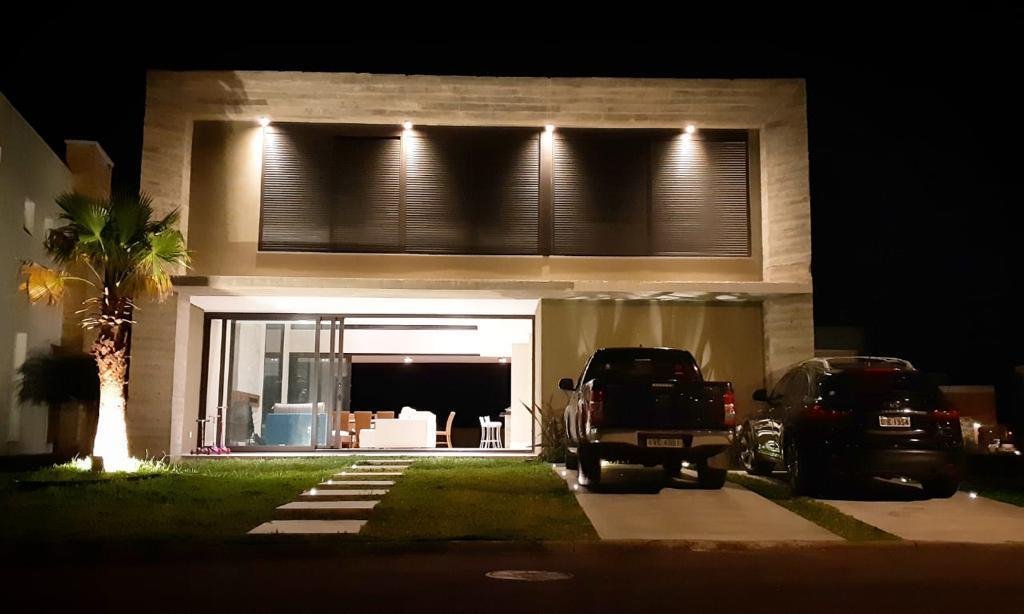 Sobrado com 4 suítes, sendo 1 térrea. Sala de estar/jantar com pé direito duplo. Área de estar totalmente integrada à varanda com churrasqueira e lareira. Piscina com banho auxiliar junto à varanda. Fachada em concreto aparente. Piso em concreto polido no pavimento térreo, e demais pisos em porcelanato. Esquadrias em PVC preto, com telas e persianas automatizadas nos dormitórios.