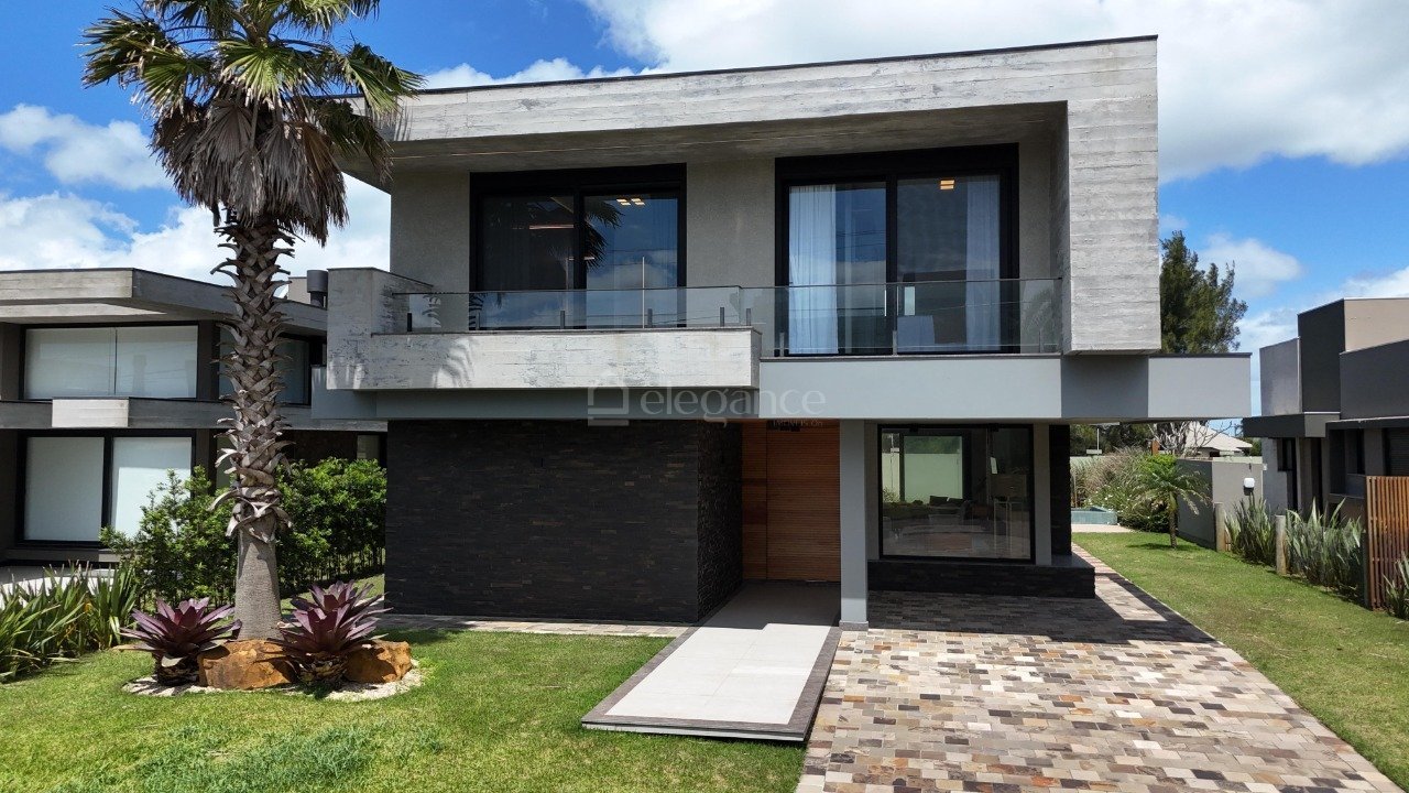 Belíssima casa estilo sobrado com 5 suítes, alto padrão construtivo, em condomínio fechado na praia. Moderna casa estilo sobrado, nunca habitada, composta por 5 amplas suítes, sendo 1 suíte térrea, amplo living em 3 ambientes com lareira, cozinha integrando o living, lavabo, área de serviço, as 4 suítes do andar superior com sacada, amplas varanda integrando ao deck e piscina de concreto aos fundos com vista para o lago, depósito, churrasqueira, vaga de garagem para 4 carros.