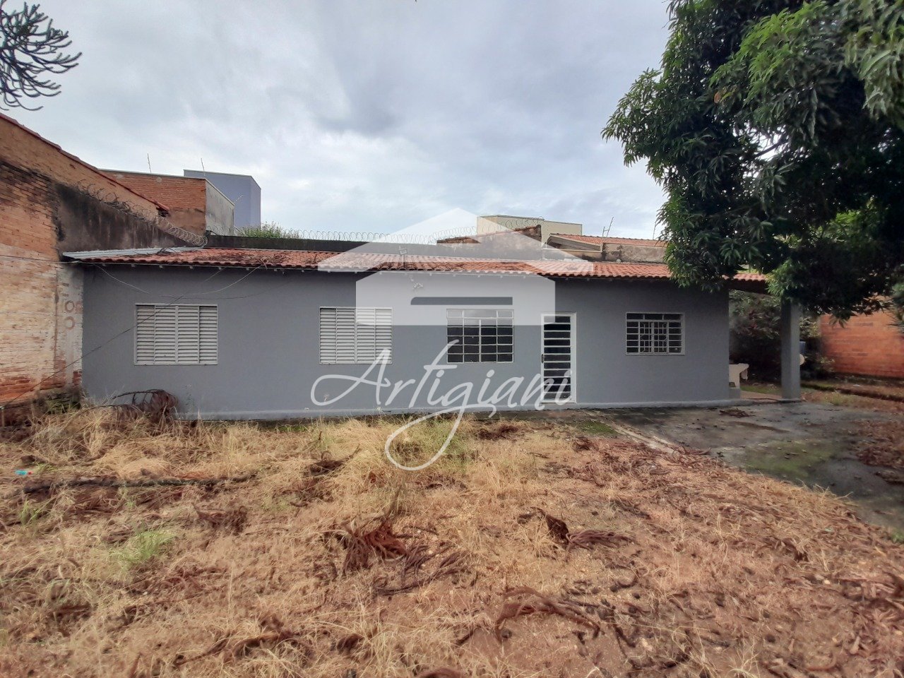 Casa com 2 dormitórios, sala, cozinha e banheiro, área de serviço coberta, quintal grande arborizado, garagem para 1 carro e entrada para vários carros, forro, área construída de 70m².