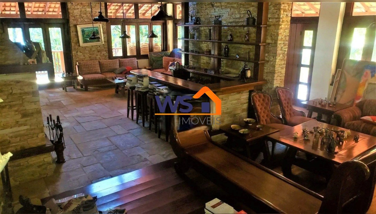 Casa em terreno de 7.200 m² com leve aclive constituído. Casa com 652 m² construídos, 5 quartos, sendo 2 suítes com closet e uma delas máster com hidromassagem e sauna, 4 salas, sendo uma delas com lavabo e adega, e todas as salas com piso em madeira de lei e pedra Ouro Preto, excelente acabamento, lareira, roupeiro, despensa, cozinha enorme, escritório, DCE, espaço gourmet com fogão, forno e defumador à lenha, pomar, piscina aquecida, árvores frutíferas e canil. Um loft no nível da garagem com entrada independente para hóspedes com sala, quarto, cozinha e banheiro. Casa de hóspedes com 2 quartos, sala, cozinha e banheiro, revestida em cerâmica. 6 vagas de garagem, sendo 3 paralelas e cobertas e 4 livres descobertas. As informações podem sofrer alterações sem aviso prévio.