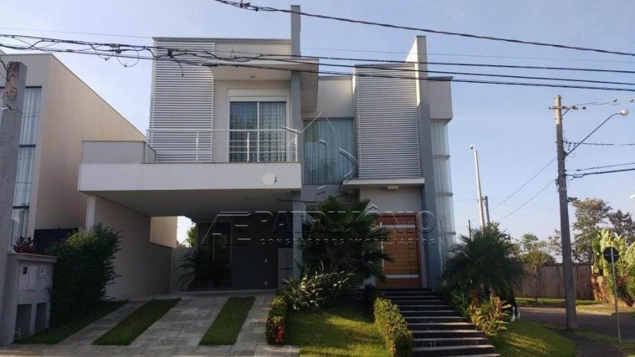 Sobrado em condomínio com sala 3 ambientes, lavabo, cozinha planejada, despensa, 3 suítes sendo 1 master com closet e ar condicionado, todas com varanda, escritório que pode reverter para suíte, sacada, mezanino, área de serviço, espaço gourmet, piscina, quintal e 4 vagas de garagem sendo 2 cobertas. Acabamento Interno: Dormitórios com piso de madeira Jatobá com 8mm de espessura, demais cômodos em piso porcelanato. Hall de entrada com piso em pedra de mármore e porta pivotante de madeira. Sala de estar com pé direito duplo e teto rebaixado, sanca em gesso com iluminação embutida. Sala de jantar com pé direito duplo. Lavabo com bancada em mármore e metais e louças de qualidade. Cozinha com móveis planejados, bancada em granito e esquadrias em inox. Escada moderna com degraus de vidro e corrimão em inox. Amplo mezanino interligando os quartos. 3 suítes sendo uma máster, closet, bancada em mármore. Todos dormitórios com esquadrias metálicas com telas. Acabamento Externo: Espaço gourmet com churrasqueira, pia com bancada em granito. Quintal com corredor lateral ateliê e piscina. Garagem para 4 carros sendo 2 vagas cobertas. Descrição do Bairro: Infraestrutura completa em comércios e serviços. Descrição do Entorno: Próximo a shopping, hipermercados, colégios, farmácias, posto de combustível e transporte público. Fácil acesso à rodovia.
