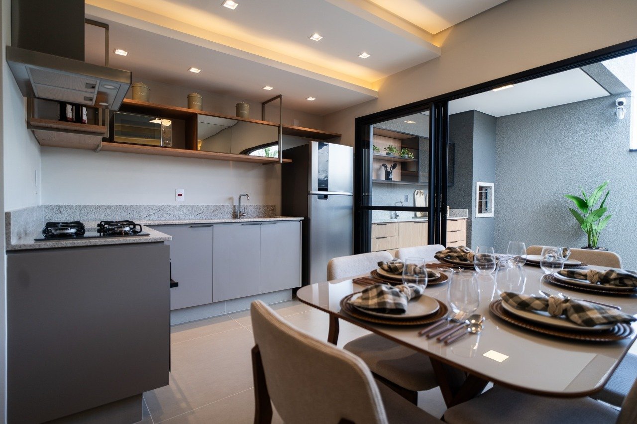 Térreo: Sala de estar, sala de jantar, banheiro social, cozinha. Churrasqueira e área de serviço e duas vagas de garagem cobertas. Piso superior: 03 Quartos, 01 suíte com closet e varanda. Diferenciais: Acabamento - Bancadas em mármore branco nos banheiros e granito verde Ubatuba na cozinha; - Banheiros com revestimentos 30x60 retificado e piso retificado 60x60; - Sala de Estar e Jantar piso porcelanato 70x70; - Escada em granito verde Ubatuba; - Forro na Sala e Cozinha; - Metais; Bacia sanitária com duplo acionamento. Conforto e Praticidade - Ponto de água para geladeira, lava-louça e purificador; - Infraestrutura para SPA no quintal das casas; - Infraestrutura para ar-condicionado na sala e dormitórios; - Infraestrutura para carregamento veicular; - Infraestrutura para aquecimento solar; - Espaço Market; - Vagas para visitantes.