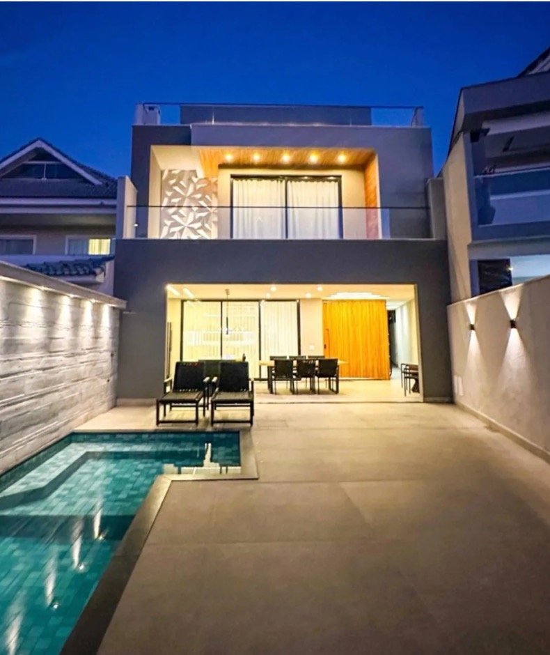 Em um dos condomínios mais desejados da região, esta residência contemporânea tríplex impressiona pela arquitetura imponente, acabamentos refinados e projeto de interiores elegante. Com 490 m² de área construída, o imóvel é vendido porteira fechada, totalmente mobiliado e decorado, pronto para morar. No primeiro pavimento, a área social se integra de forma harmoniosa ao lazer: piscina com cascata, varanda gourmet com churrasqueira e bancadas em granito, ampla sala integrada à cozinha moderna e planejada, despensa, lavabo com acesso interno e externo, além de suíte espaçosa e área de serviço externa coberta. O segundo pavimento abriga a área íntima, com três suítes com closet, sendo duas com varanda privativa. A suíte master é um verdadeiro refúgio, com sala de banho sofisticada, bancada dupla, dois chuveiros e banheira de hidromassagem. No terceiro pavimento, um espaço versátil e exclusivo: sala em dois ambientes, ideal para cinema e jogos, escritório, banheiro social com possibilidade de conversão em suíte e um amplo terraço, perfeito para momentos de lazer ou contemplação. Uma residência que combina sofisticação, conforto e funcionalidade, ideal para quem busca exclusividade e qualidade de vida.