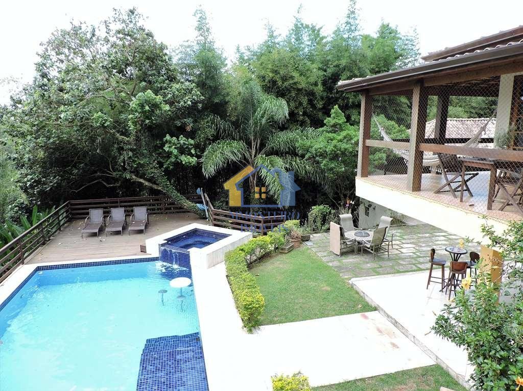Excelente casa com ótimo madeiramento e acabamento. Imóvel construído para morar, repleto de armários e com janelas teladas. Pisos de madeira, cerâmica e pedra. Hall de entrada social pelo pátio lateral, integrado à varanda em L com linda vista. Living para 3 ambientes com lavabo. Salas de jantar, estar e lareira, voltadas para linda varanda. Piscina de alvenaria com escada interna de fácil acesso, aquecimento solar e trocador de calor. Com prainha, hidro, cascata, bar molhado, deck, ducha e tratada por dessalinização. Varanda gourmet completa no piso inferior, com cozinha americana, bancada, pia, armários, balcões e despensa. Churrasqueira e forno de pizza em ambientes integrados ao lazer com banheiro e lavatório externo. 4 dormitórios, sendo 2 suítes com estação de trabalho e armários. Um dos quartos pode ser transformado em sala íntima para TV ou escritório. Copa cozinha repleta de armários planejados. Lavanderia com armário, tanque e suíte de serviço com banheiro externo. Suíte para caseiro ou escritório. Casa de máquinas. Trocador de calor. Depósito, escritório. Adega. Garagem para 3 vagas cobertas, mais um grande pátio com muitas vagas. Aquecimento: Boiler solar com suporte elétrico. Abastecimento de água: Sabesp. Armazenamento: 3.000 litros. Permuta: Estuda proposta até 30% do valor.