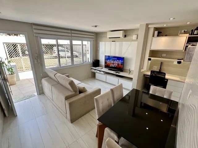 A casa possui sala de estar e jantar, cozinha, lavabo, área de serviço e dependências que podem ser transformadas em um pequeno escritório. No piso superior, possui três quartos, sendo duas suítes. Também possui uma área externa para acomodar dois carros. Por ser uma rua fechada, o carro pode ser acomodado em uma vaga na própria rua fechada. Piso em porcelanato na sala, cozinha e banheiros. Piso de madeira maciça nos três quartos, corredor superior e escada. Instalação de equipamentos de ar condicionado na sala e suíte casal. Armários embutidos de primeira linha nos quartos, banheiros, cozinha e home office. Painel laqueado da TV e rack da sala. A cozinha foi revestida com pastilhas na parede acima da bancada e a pia com uma nova bancada de granito. O fogão embutido é de 6 bocas. Na área de serviço, tanque em aço inox embutido. SISTEMA DE GERAÇÃO PRÓPRIA DE ENERGIA ELÉTRICA, TOTALMENTE LEGALIZADO GERANDO ALTA ECONOMIA DE ENERGIA.