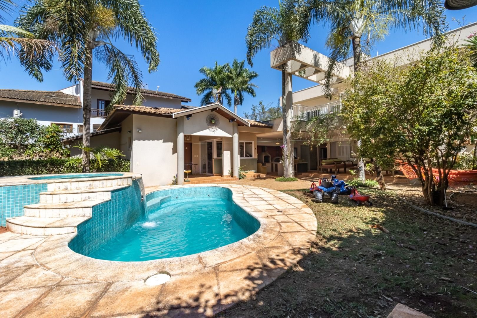 Código do Imóvel: CM1783288-2 Moderno e diferenciado projeto de Arquitetura Pé direito alto com pergolado/telhado de vidro, muita iluminação natural e todos os ambientes integrados Paisagismo já formado, com luminotécnica no jardim e quintal Salas de estar e jantar com lareira integrada aos dois ambientes. Lavabo, home theater com ar-condicionado e isolamento térmico e acústico, escritório amplo com armários e persianas. Excelente terraço e varandas, jardim de inverno com vista magnífica do pôr do sol. Com 3 amplas suítes todas com closet, mais uma suíte na parte térrea da casa com saída lateral para o jardim, para hóspede ou idosos ficarem com privacidade. Cozinha planejada com ilha, despensa e acesso a garagem. Belo apartamento de empregada Espaço gourmet e cozinha com pisos e bancadas com ladrilhos hidráulicos artesanais. Adega subterrânea para 200 garrafas, toda em madeira. Espaço gourmet amplo com churrasqueira, fogão à lenha e forno de pizza. Área de lazer com piso. Piscina e spa de alvenaria com aquecimento solar e cascata, 2 vestiários, grande sauna seca, brinquedoteca/sala de ginástica com armários, canil, quintal com equipamentos para crianças. Quarto de despejo. São 3 vagas cobertas de garagem e bicicletário. Sótão com planetário. Pintura látex, pisos em madeira e piso frio. Aquecimento solar com apoio elétrico (raras vezes utilizado). 3 caixas d'água de 1.000 litros cada uma e boiller. Esquadrias de alumínio sob medida com tela, excelente qualidade, quintal com pomar/horta, copa no andar superior. Condomínio com lago de carpas, dois lagos, bosque para caminhada, quadra de tênis e beach tênis. Quadras e salão de festa. Casa em local privilegiado dentro do condomínio, bem tranquila a rua sem barulho. O terreno da casa faz fundos com o bosque. Venha visitar e se encantar com este estilo rústico/contemporâneo.