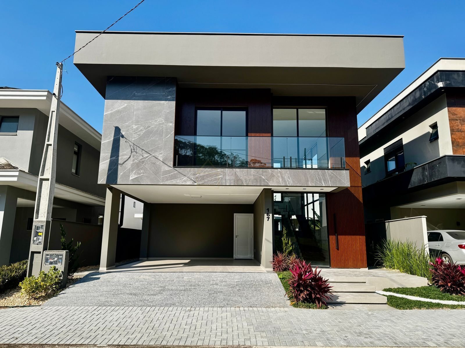 Sobrado no condomínio fechado com 3 suítes à venda no bairro Vila Nova - Joinville - SC por R$ 2.290.000,00. Sobrado novo com 2 pavimentos, acabamento de alto padrão, com área construída de 237m², em terreno de 240m². O imóvel possui 3 suítes, sendo 1 master, mezanino home office, sala de estar, jantar e cozinha, espaço gourmet na área de churrasqueira, lavabo, área de serviço, 2 vagas de garagem cobertas individuais, piscina e sistema de aquecimento a gás. O condomínio conta com salão de festas, quadras de esportes, academia, piscinas, adulta e infantil, lago, quiosque com churrasqueira, playground, lago com carpas, supermercado e trilha no bosque, proporcionando lazer completo para toda a família. Além disso, possui portaria 24 horas e estacionamento para visitantes.
