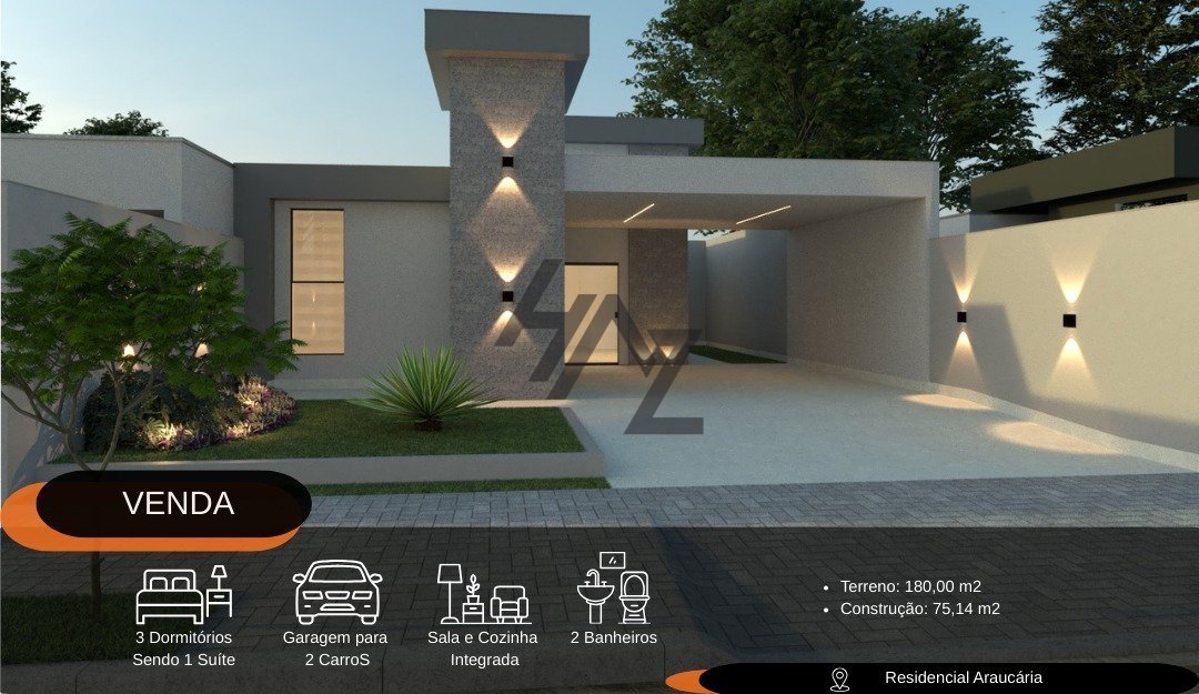 **Descrição do Imóvel** Apresentamos uma excelente oportunidade de adquirir uma charmosa casa localizada na Rua Inesio Batistela, 48 - Residencial das Araucárias, em Cianorte/PR. Com 75 m² de área construída, este imóvel é ideal para famílias que buscam conforto e praticidade. **Características Principais:** - **Dormitórios:** 3 aconchegantes quartos, sendo 1 suíte, proporcionando privacidade e conforto. - **Banheiros:** 2 banheiros bem distribuídos, garantindo comodidade para todos os moradores. - **Estacionamento:** 2 vagas de garagem, facilitando o estacionamento de veículos. - **Piso:** Situada no térreo, oferecendo fácil acesso e comodidade. A casa é perfeita para quem aprecia um ambiente tranquilo, rodeado pela natureza e com a conveniência de estar próxima a todas as facilidades da cidade. O Residencial das Araucárias é um local seguro e familiar, ideal para criar memórias inesquecíveis. Não perca a chance de conhecer este imóvel que pode ser o lar dos seus sonhos! Agende uma visita e venha se encantar com tudo o que esta propriedade tem a oferecer.