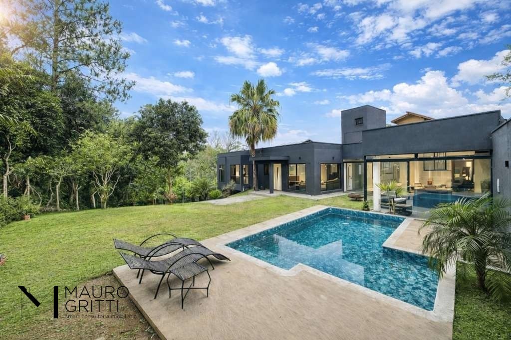 Linda casa com muita privacidade, voltada para área preservada. Foi reformada (telhado, elétrica, banheiro, cozinha e piscina). Ótima localização em final de rua tranquila, arborizada e sem saída. Condomínio fechado com lazer, controle de acesso e segurança 24 horas. Casa envidraçada, ensolarada, bem arejada e iluminada. Portas e janelas em alumínio preto e vidro. Pisos em porcelanato com antiderrapante na área externa, revestimento de madeira, cerâmica, ardósia e Miracema. Louças e metais de qualidade. Jardim gramado com projeto de iluminação. 3 acessos: social/lazer, garagem e serviço. Entrada social por uma porta de madeira e vidro. Lavabo com tampo em travertino e parede em canjiquinha. Hall de distribuição social, íntimo e de serviço, com uma grande claraboia envidraçada e um biombo de alvenaria. 4 dormitórios sendo 3 suítes envidraçadas com bay window e vista para a natureza, 2 suítes com ar-condicionado, sendo a master com TV e 2 closets. Podendo ser revertida para 4 suítes, pois um dos quartos está sendo usado como segundo closet da master. Quarto de hóspedes / escritório. Banheiros com bancadas, espelhos, gabinetes e box de vidro, sendo a master integrada ao closet, com espelho grande, nicho, torneiras monocromadas. 1 dos banheiros com ferragens de segurança e acessibilidade. Family room / TV integrado ao salão de festas, com porta de vidro para o quintal. Living para 6 ambientes integrados ao lazer, com salão de festas gourmet, jardim e piscina. Estar, bar, lareira, TV, jantar/almoço/café e cozinha completa. Área de serviço aberta ensolarada e lavanderia fechada planejada com armários e gabinetes, tanque, banheiro com box de vidro, quarto de serviço ou depósito. Salão de festas gourmet com bar, avarandado e envidraçado, voltado para piscina, jardim e área verde preservada. Cozinha integrada planejada repleta de armários, com churrasqueira, tampo em granito, cuba inox, torneira gourmet, ilha com balcão para 3 bancos, fogão cooktop, coifa inox, geladeira, micro-