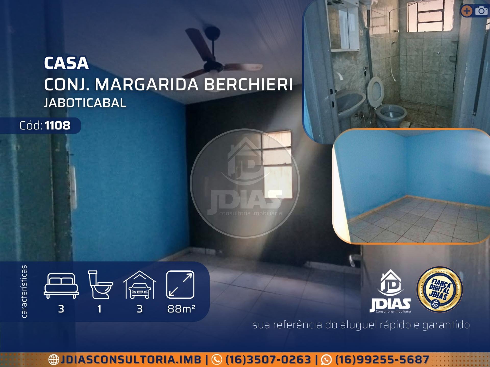ALUGA-SE<br> Casa em Conjunto Habitacional Margarida Raymundo Berchieri - Jaboticabal - Cód: 1108<br> 3 Quarto(s) 1 Sala(s)<br> 1 Banheiro(s) <br> 3 Vaga(s) sendo 1 coberta(s) / 2 descoberta(s) <br> Área construída: 88 m² <br> Armário(s): Cozinha<br> Diferenciais: Localização <br> Mobiliado: Não é mobiliado<br><br> Mais informações, fotos e valores do imóvel:<br> Link disponível mediante solicitação.<br><br>----------<br><br>Informações para Alugar:<br>• Incluso no aluguel: IPTU <br>• Garantia Locatícia: Fiança digital (Sem fiador, zero-burocracia, segurança e rapidez)<br>• Faça uma simulação e saiba se já pode alugar o imóvel.<br><br>-----------------------------------------------<br><br>️ Para saber a localização aproximada do imóvel, clique no botão "mapa" ao lado de "fotos".<br><br>ℹ️ Valores e informações descritas estão sujeitas a alterações a qualquer momento, validação mediante a verificação de disponibilidade e confirmação.<br><br> Entre em contato e agende uma visita:<br>⏰ Segunda à sexta das 08h às 18h<br> R. Humberto Biancardi, 163 - Vila Serra, Jaboticabal - SP<br> Receba os imóveis recém cadastrados - acesse:<br><br>
