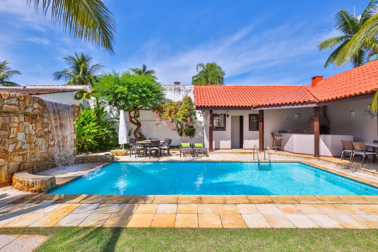 Uma casa de 382 m², em dois pavimentos, toda bem conceituada e construída em terreno de 15 m x 40 m. No primeiro pavimento, a sala de estar tem pé-direito duplo, sala de TV contígua e sala de jantar em nível elevado. As salas são voltadas à área e recebem a luz natural da varanda: jardins com paisagismo, piscina com cachoeira ionizada, sauna seca, ducha, churrasqueira e banheiro. Lavabo para visitas. Adega. Uma confortável suíte. A copa cozinha planejada permite integração com a sala de jantar. Despensa. Lavanderia. Dois quartos de serviço com banheiro. A escada linear e o elevador hidráulico levam ao segundo pavimento: Mezanino mirando a sala principal e abertura no telhado para iluminação zenital. Quatro suítes. Suíte master com closet. Duas suítes avarandadas voltadas à frente da casa. 4 vagas de garagem e 3 vagas de visitantes. Condomínio com segurança, muito próximo às melhores escolas.