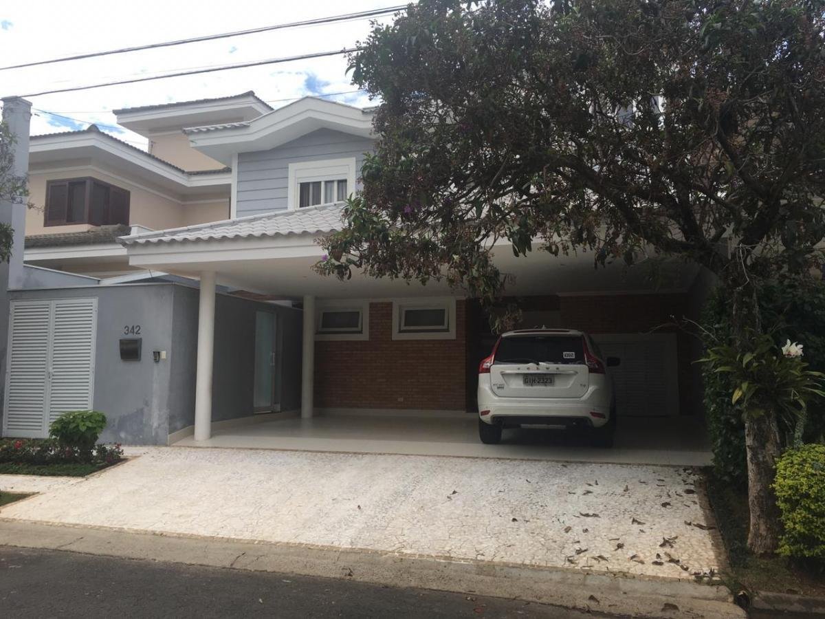 Sobrado com 4 suítes, sendo uma suíte master com hidro e varanda, closet com armário roupeiro. Home 30 mts² com lareira e banheiro. Sala estar dois ambientes. Sala jantar com bay Window. Copa, cozinha com cooktop, forno elétrico. Área de serviço com bancada de granito. Quarto e banheiro de empregada. Área de serviço externa com armário. Janelas com persianas elétricas e telas mosqueteiros de PVC. Portas grandes de correr nas salas de PVC. Portões com vidros em PVC. Área gourmet com cooktop, fritadeira, grelha de pedra vulcânica e churrasqueira, tudo em inox e vidro, forno e fogão a lenha. Cobertura de vidro e fechamento com toldo. Sauna com vestiário grande. Piscina em alvenaria com iluminação e aquecimento. Casa toda em piso de madeira e porcelanato. Ar condicionado em todos os quartos, salas e home. Garagem coberta para três carros com armário. Aquecedor a gás. Excelente condomínio com portaria 24hs, infraestrutura de lazer com quadras de tênis, futebol, voleibol, sala de jogos, parquinho, área de academia ao ar livre, trilhas para caminhadas dentro dos bosques, quadra de bocha, rampa de skate, lago para pesca esportiva, espaço cultural com biblioteca e área de convivência social para moradores. O condomínio possui a vantagem de ter duas portarias que servem os moradores do residencial, visitantes e prestadores de serviços, sendo uma portaria localizada em área próxima a comércio local e com fácil acesso à rodovia.