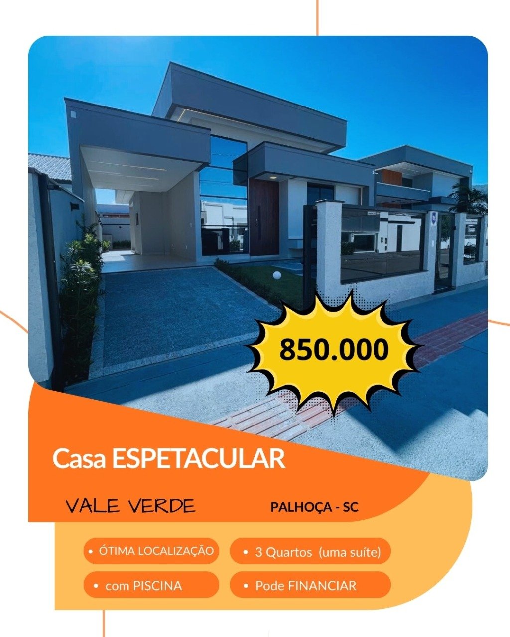 Uma Casa de Altíssimo Padrão no Loteamento Vale Verde - Bairro Bela Vista, Palhoça/SC! Imóvel moderno e bem distribuído, localizado em uma das regiões mais valorizadas da cidade; Terreno com 200m², sendo 100m² de área construída, oferecendo conforto, funcionalidade e excelente padrão de acabamento; Características do imóvel: 3 dormitórios, sendo 1 suíte, 2 banheiros (social e suíte), sala de estar com pé direito alto e sanca em gesso, iluminação em LED e muito mais... Área de serviço com churrasqueira e piscina, garagem para 2 veículos, sendo 1 vaga coberta... Diferenciais: ar-condicionado já instalado na suíte e em um dos dormitórios (2 aparelhos).