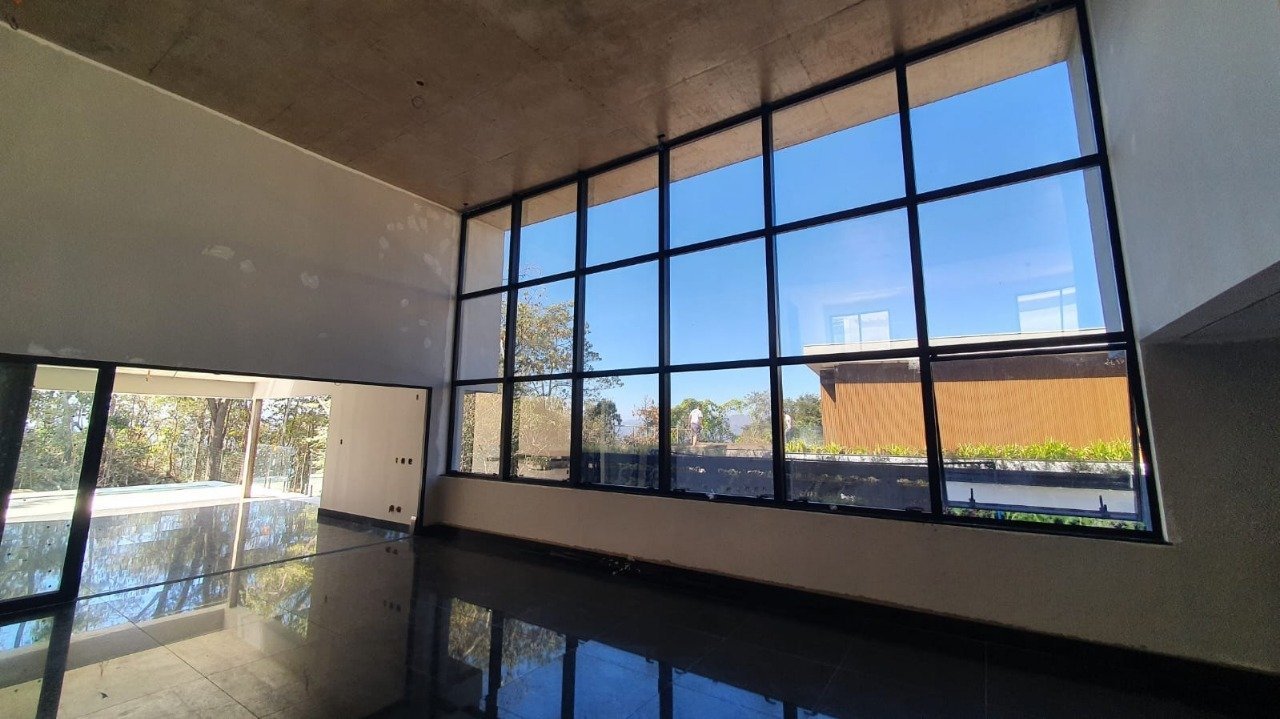 Linda casa em fase final de acabamento, no condomínio em Nova Lima - MG, a 10 km do shopping. Com uma infraestrutura diferenciada, construída com estrutura elevada do solo, possui cômodos amplos, iluminados e arejados, com 640m² de área construída, e com preparação para ar condicionado. Essa casa conta com uma ampla sala com pé direito duplo e uma parede de vidro, com acabamentos de alta qualidade, e integrada com a área gourmet e piscina. Possui porta de entrada imponente e pivotante. A área gourmet é ampla e coberta, com piscina e área descoberta. A cozinha é espaçosa com despensa, e dependência completa. Completa o pavimento térreo uma suíte para hóspedes, e a garagem para 4 carros. No segundo pavimento temos 3 suítes e amplo estar íntimo. A suíte master possui closet, terraço e escritório independente.