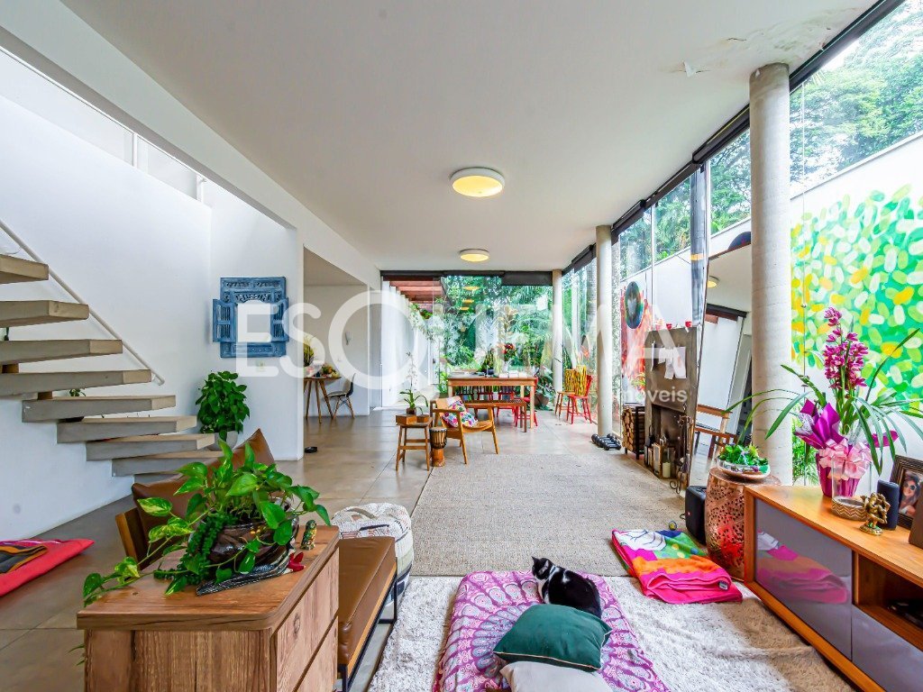 Casa localizada em uma das melhores ruas do bairro. Logo na entrada, possui um jardim com lago ornamental. Área social com muito vidro, que permite ótima insolação. Todos os ambientes são integrados: sala de estar com lareira, sala de TV, sala de jantar e cozinha, além de lavabo na entrada. Terraço que acessa um jardim enorme, com piscina e diversas árvores frutíferas. Na área íntima, são 3 suítes, sendo a principal no térreo e com vista para o jardim, e as outras 2 no andar de cima, ambas acessando o grande terraço do piso superior. Área de serviço com parte coberta e descoberta, com quarto e banheiro.