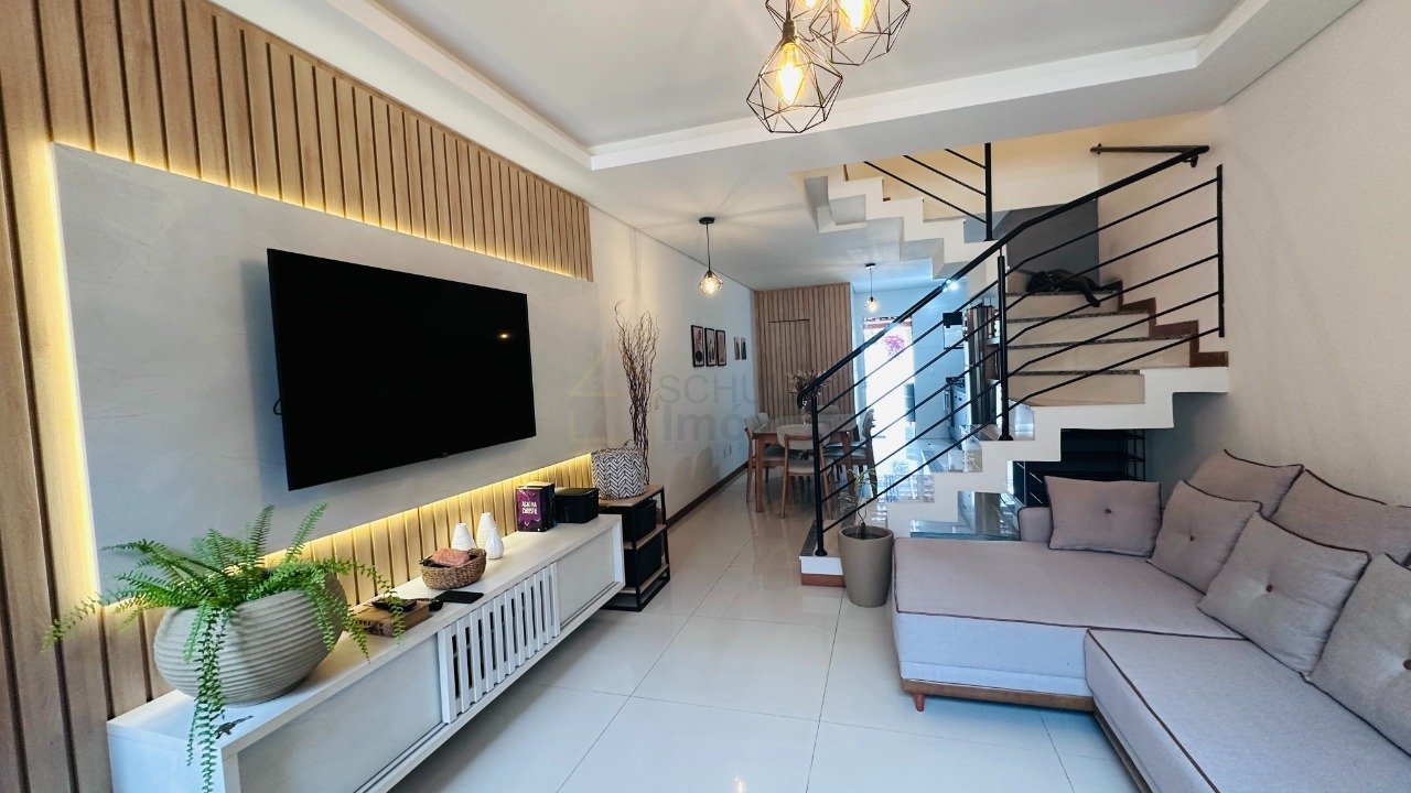 Excelente sobrado geminado à venda no bairro Saguaçu com área privativa de 83,25m² e 1 vaga de garagem coberta. O imóvel possui, no piso superior, 3 dormitórios, sendo 1 suíte, 1 quarto, 1 closet, podendo reverter o closet em mais 1 quarto e um banheiro social. No térreo, sala de estar com home, painel com iluminação indireta, lavabo, cozinha e sala de jantar integrada. Oferece, ainda, área externa com espaço gourmet, churrasqueira, ampla bancada de apoio com pia e armários, fogão a lenha e área de serviço independente. Armários planejados em todos os cômodos. Não perca essa oportunidade.