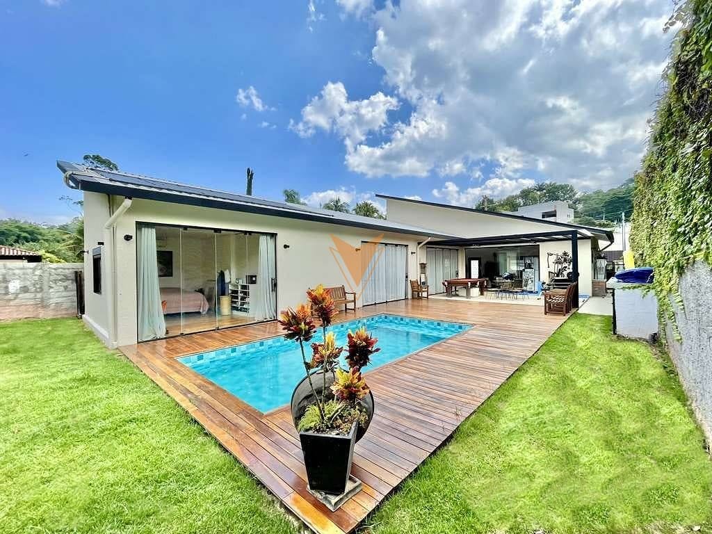 Código do Imóvel: CM1280673-26. CASA TÉRREA. Contemporânea e confortável. Oportunidade única! Prática, integrada, com acessibilidade e bom acabamento. Localização privilegiada na Granja Viana. Rua fechada, tranquila e sem saída. Lugar tranquilo! Com segurança e portaria virtual 24 horas, cercada por condomínios e outras ruas fechadas. Próxima a parques, clubes, supermercados, principais escolas e todo excelente comércio local. Fácil acesso às principais vias da região. Ensolarada, bem arejada e iluminada. Face norte. Jardim gramado, com espaço para paisagismo, campinho, horta, academia. Portas e janelas em alumínio preto e vidro, com persianas nos quartos. Pisos em concreto polido, tacos de madeira e deck de ipê. Louças e metais de qualidade. 3 acessos: social, lazer e serviço. Entrada social pela garagem. Lavabo com piso em taco e tampo em mármore. Mezanino com acesso por escada de ferro, espaço ideal para escritório, estudos e TV. Corredor íntimo totalmente envidraçado, integrando as 3 suítes diretamente ao lazer e piscina. 3 suítes integradas à piscina e jardim, com ar condicionados, nichos preparados para armários e na suíte máster com espaço para closet. Banheiros com tampos em Travertino, espelho e box de vidro, sendo a máster com 2 cubas, 2 duchas e hidro dupla. Living totalmente integrado, para 4 ambientes, voltados para o lazer com uma grande varanda, piscina, quintal e jardim. Estar, TV, jantar / bar e cozinha integrada planejada com bancada e ilha. Área de serviço aberta ensolarada e lavanderia com tanque. Varanda com cobertura em ferro e policarbonato, já preparada para um espaço gourmet completo e/ou academia. Piscina revestida em vinil, com aquecimento solar, grande deck em Ipê, solarium e casa de máquinas. Canil. Depósito. Garagem para 3 vagas cobertas. Aquecimento central de água: não possui - usa chuveiros elétricos. Tubulação preparada para receber sistema Fotovoltaico. Abastecimento de água: Sabesp. Armazenamento: 3.000 litros.